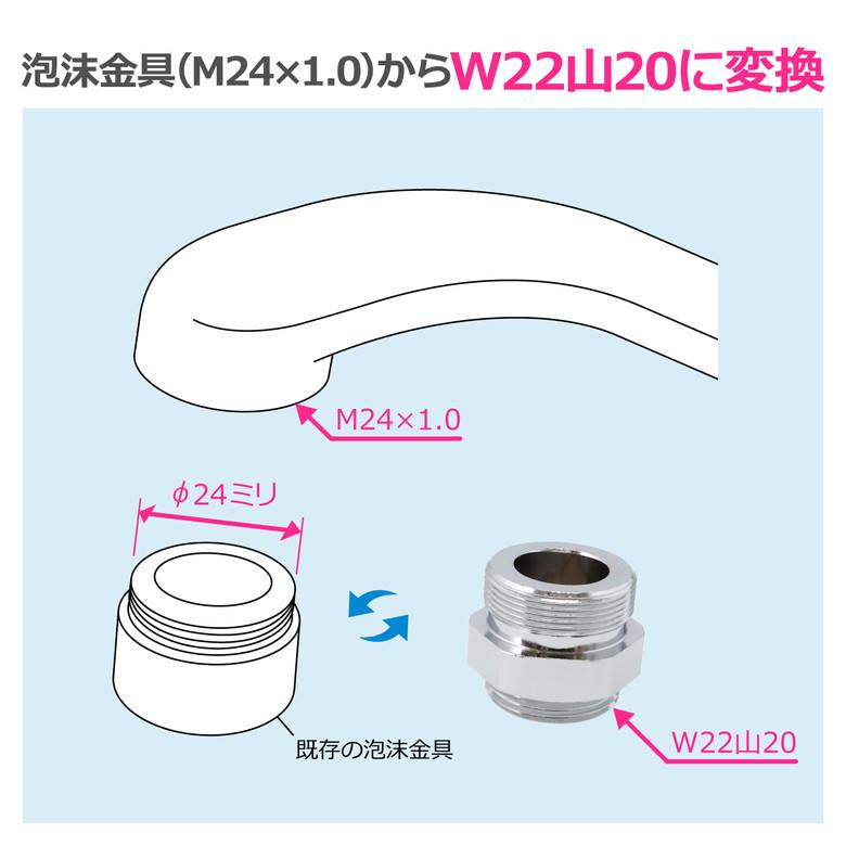 ●泡沫金具ネジのM24×1.0にW22山20ネジの泡沫金具を取付けることができるアダプターです。