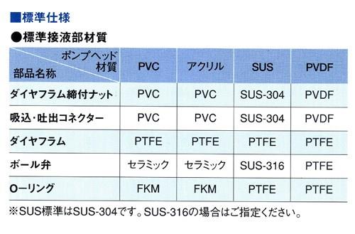 ●高粘度用(2,000mPa・sまで)と標準品(300mPa・sまで)がありますのでご指示ください。但しPVDF製は高粘度仕様がございません。ご注文の際、備考欄にご希望の流体名ご記入ください。