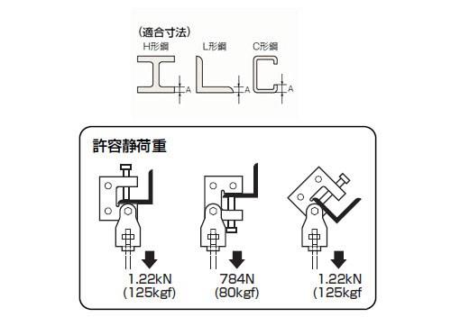 ●適合寸法(A):H・L形鋼(鋼材厚24mm迄)、C形鋼(ツバ20mm迄)