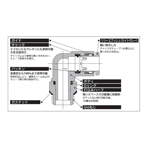●適用チューブ。チューブ材質:FEP、PFA、ナイロン、ソフトナイロン、ポリウレタン チューブ外径:Φ4、Φ6、Φ8、Φ12、Φ16