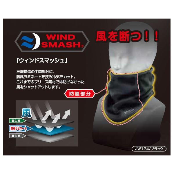 ●風を断つ!「ウィンドスマッシュ」三層構造の中間部分に、防風ラミネートを挟み冷気をカット。これまでのフリース素材では防げなかった風をシャットアウトします。
