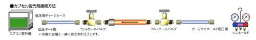 ●カプセル蛍光剤は、蛍光剤注入で最もスタンダードな方法で、通常のガスチャージの際に蛍光剤カプセルを挟んで使用する使い捨てタイプです。