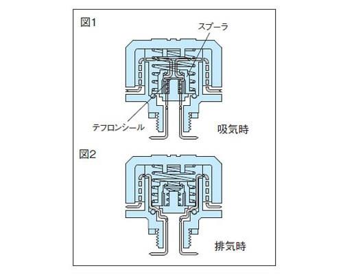 ●吸気設定圧力(目安):30hPa オイルが吐出されるなどしてタンクの気圧が低下すると、約30hPaにて自動的に弁(テフロンシール)を開き吸気します。