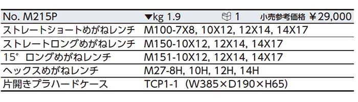 ●ストレートショートめがねレンチ(M100)、ストレートロングめがねレンチ(M150)、15°ロングめがねレンチ(M151)、ヘックスめがねレンチ(M27)の4種類混合セットです。