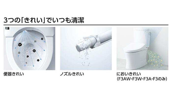 ●【F3AW個別機能】においきれい、オート開閉、リモコン便座、便ふた開閉、オート便器洗浄、リモコン便器洗浄、瞬間暖房便座、やわらかライト、温風乾燥