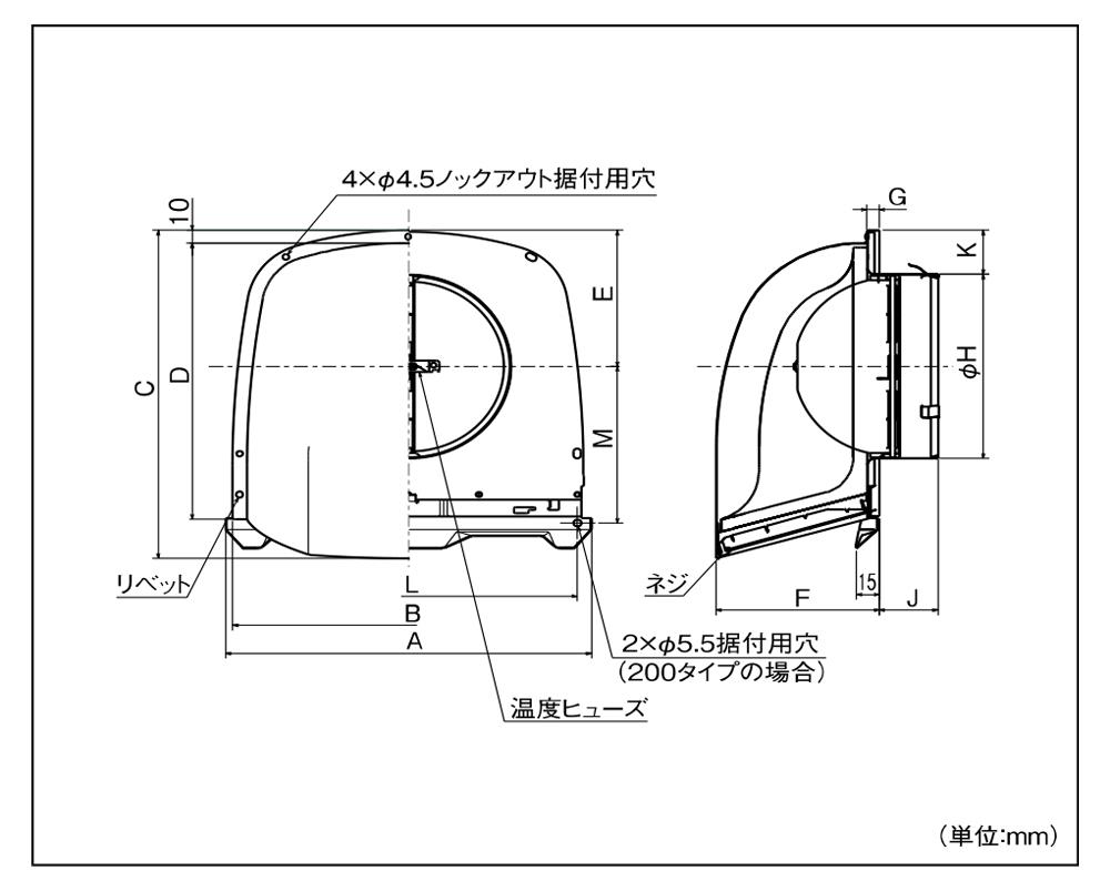 防音形深形フード(不燃・耐湿タイプ・ワイド水切タイプ) 網 防火ダンパー付 <AT-SNS> - AT-200SNSD5B
