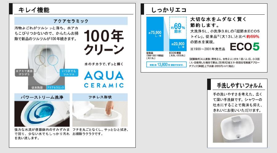 ●【キレイ機能】アクアセラミック・鉢内除菌・パワーストリーム洗浄・お掃除リフトアップ・女性専用レディスノズル・スッキリノズルシャッター・ノズルそうじ・ノズルオートクリーニング・ノズル先端着脱・キレイ便座・便フタワンタッチ着脱・抗菌樹脂・エコ機能:超節水ECO5・スーパー節電・ワンタッチ節電・電源スイッチ