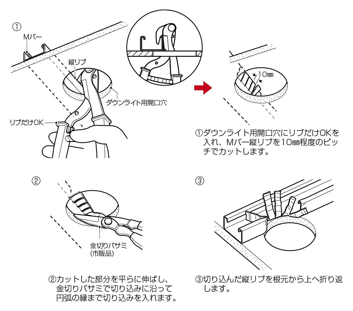 ●天井下地材(Mバー)のリブを切断する場合に使用します。(ダウンライト用穴あけ時に障害となるMバーを切除又は加工する際の金切りバサミの作業がリブを切断する事により簡単に行えます。)
