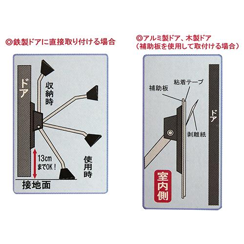 ●付属の粘着式補助板を使用することにより、アルミ製・木製ドア等にも取り付けできます。