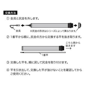 ●交換方法1.金具と尻金を外します。2.1番竿から順に、尻金の方から交換する竿を抜き取ります。3.交換した竿を、順に戻して尻金を取り付けます。4.竿を引き出して、交換した竿が抜けないことを確認してからご使用ください。